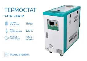 Электрический шкаф термостата отделен от общего корпуса, на передней панели термостата расположен пульт управления, с которого совершается настройка параметров работы. При включении насоса перекачки теплоноситель (вода) поступает в герметичный блок нагрева, где соприкасаясь с поверхностью электрических нагревателей, доходит заданной температуры. При достижении заданной t нагрев теплоносителя автоматически завершается. Из блока нагрева теплоноситель поступает в трубопровод, к которому подключается термостатируемый объект (пресс-форма), для регулировки давления подаваемого теплоносителя на нагнетающем трубопроводе смонтирован байпасный кран.